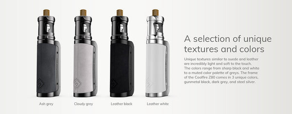 Innokin Coolfire Z80 Box Mod Kit developed by Innokin, The box mod received an ergonomic zinc alloy body, painted in four color combinations. The back side was rounded under the grip and decorated with a stitched artificial leather insert. A glossy control panel, consisting of a fire button, a display, a couple of small keys and a USB-C port, was stretched along the narrow front side. The landing site was limited to a diameter of 25 mm. Access to the battery compartment was limited by a twist-off cover with a hinged key.