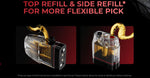 Last, two versions of the refill mechanism are available: top refill and side refill. They are sold separately and users can choose their favorite refilling way.
