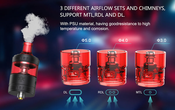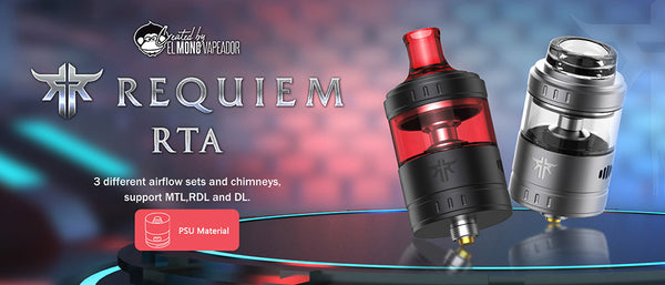 Vandy Vape Requiem RTA of 24mm is made of PSU material that has high temperature and corresion resistance. It is designed with 4.5ml e-juice capacity and innovative juice airflow. It has 3 airflow sets & chimneys and supports MTL, RDL and DL vaping. It also features airflow straight from the side for RDA-like experience. The versatile tank offers 810 and 510 systems with 2 top caps and drip tips, and the PSU airflow cap is high temperature and corrosion resistance, which is machined and constructed well.