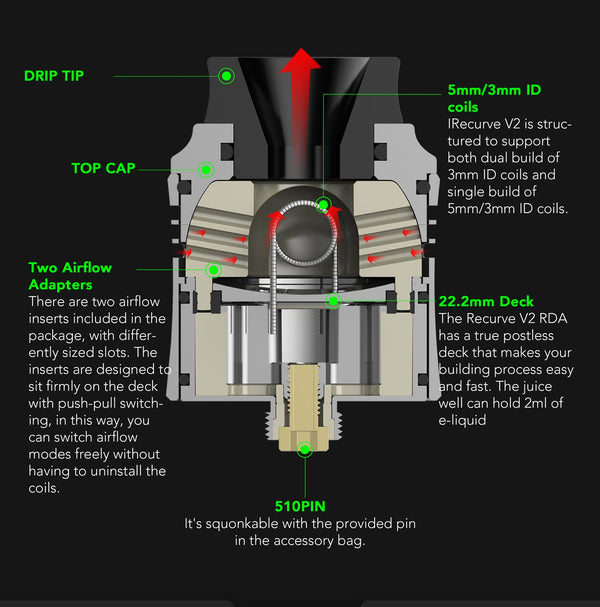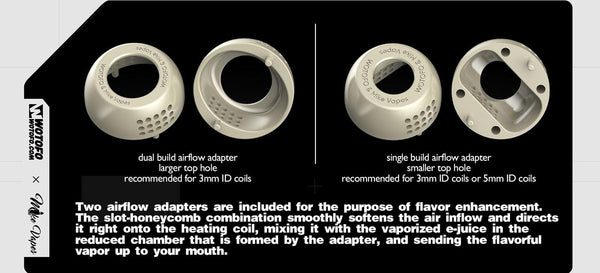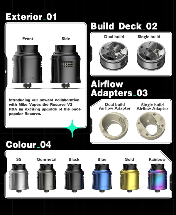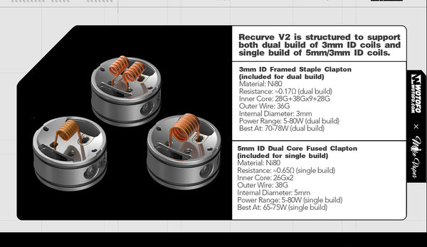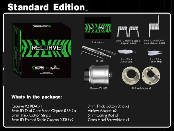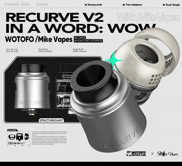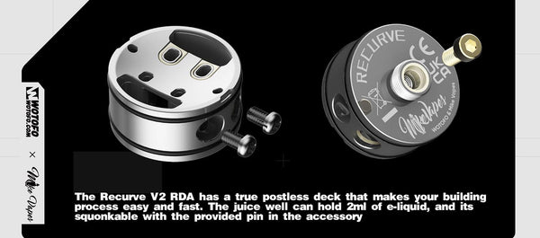 Introducing the Wotofo newest collaboration with Mike Vape--the Recurve V2 RDA an exciting upgrade of the once popular Recurve and has a diameter of 24.6mm, 35.55mm Height with the drip Tip, As for the top cap to the RDA body, it inherits the curved appearance of the first generation and is addictive. It is structured to support both dual build of 3mm ID coils and single build of 5mm/3mm ID coils, offering you user-friendly coil tools to DIY, it also includes two 3mm thick cotton strips and one 5mm thick cotton strip to be stuffed in the two large wicking ports, one on each side of the deck. The juice well can cater to 2ml vape juice, along with its two air intakes located on the side with its different-sized slots.Two airflow adapters are included for the purpose of flavor enhancement .The slot-honeycomb combination smoothly softens the air inflow and directs it right onto the heating coil , mixing it with the vaporized e-juice in the reduced chamber that is formed by the adapter , and sending the flavorful vapor up to your mouth . There’s just enough room on either side of the squared section for your coil legs, it gets some fancy tools for you to rebuild your handmade aliens, and according to its postless deck, it is easy to build and is squonkable with the provided pin in the accessory bag. Overall, it has a better and more suitable flavor than regular coils due to its DIY,