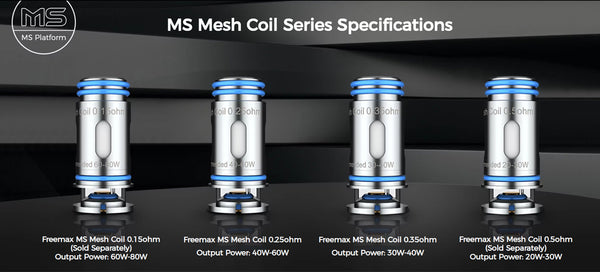 Those MS Mesh Coils are perfectly compatible with FreeMax Marvos T Kit. Brand: FreeMax Unit: 5pcs/pack Resistance: 0.15ohm, 0.25ohm Package: Simple Packing