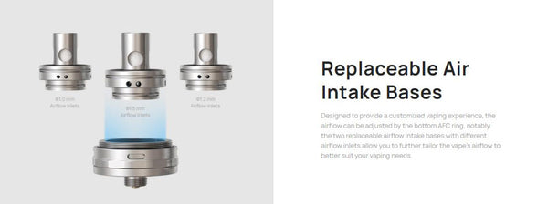 Designed to provide a customized vaping experience, the airflow can be adjusted by the bottom AFC ring, notably, the two replaceable airflow intake bases with different airflow inlets allow you to further tailor the vape's airflow to better suit your vaping needs.