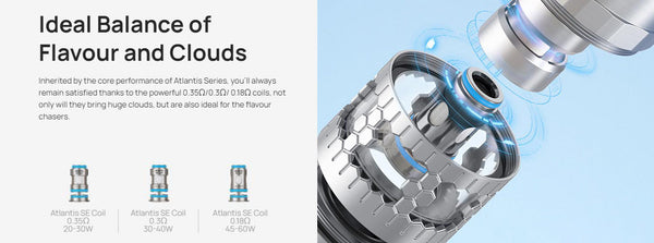 Inherited by the core performance of Atlantis Series, you’ll always remain satisfied thanks to the powerful 0.35ohm (20-30W), 0.3ohm (30-40W) and 0.18ohm (45-60W) , not only will they bring huge clouds, but are also ideal for the flavour chasers.