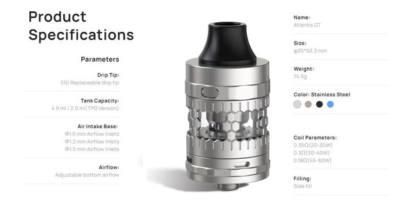 Each set contain: 1pc Atlantis GT Tank (4.0 ml) (Preinstalled glass tube, 0.3ohm Coil, ID:1.2 mm Air Intake Base)