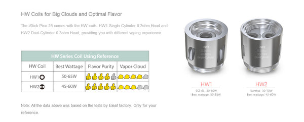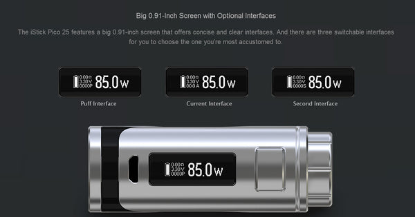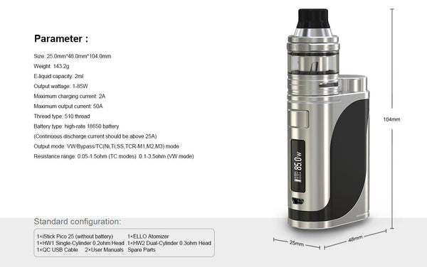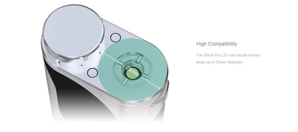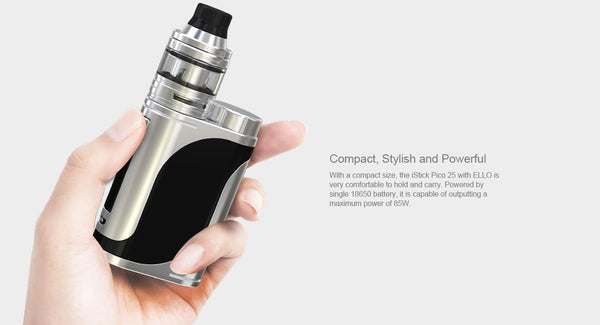 The iStick Pico 25 ingeniously packs a big 0.91-inch screen that offers a concise and clear interface, 2A quick charge capability and upgradeable firmware with preheat function in a compact, stylish yet powerful package. Powered by single 18650 battery, the iStick Pico 25 is capable of outputting a maximum power of 85W and can handle various tanks up to 25mm diameter. The ELLO atomizer that features the HW coil for ultimate flavor and retractable top for easy filling pairs with the iStick Pico 25 perfectly in terms of both appearance and performance.