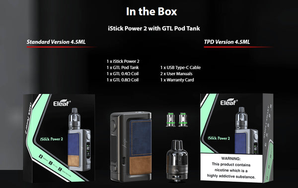 Check the Eleaf iStick Power 2 Mod Kit, which designed with a metallic texture, with a compact and durable design, built-in 3400mAh battery and max output 80W supports the regular power mode and the easy-to-use smart mode, under smart mode the device will intelligently identify your favorite output for the coil you installed. each time when you plug the pod, you will get the favorite output. the iStick Power 2 with the 0.96 inch TFT screen display will show you the vaping data clearly, such as working wattage, working mode, resistance, battery life and puff counting. the USB Type-C charging port with 2A charging current will save charging time by 50%. the GTL Pod can hold 4.5ml e-juice, with the convenient bottom e-juice refill design, the silicone stopper to prevent any leakage. Eleaf GTL Coils included designed for the dense vapor and great flavor with the maximized interaction between e-liquid and cotton.iStick Power 2 feeling great and a worth trying device.