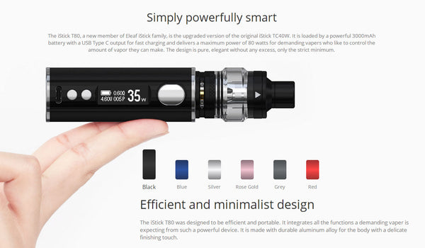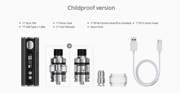 Eleaf iStick T80 Kit consists of the iStick T80 Battery and a Pesso atomizer. It is powered by built-in 3000mAh battery, which can fire up to the max output of 80W. With the oversized fire button on the side, which is easy to operate. It also has large an intelligent screen to display the vaping data clearly. The include Pesso atomizer features 5ml e-juice capacity for your options. It adopts easy top filling design and adjustable bottom airflow system to bring you larger cloud of vapor. It compatible with both E-liquid and nicotine salt, bringing smooth taste and optimal flavor. It adopts the all-new EF coils for huge clouds and intense flavor. With multiple protections, it will guarantee a safe vaping environment to you.
