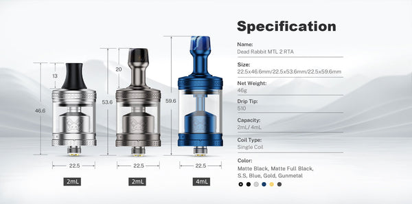 Hellvape Dead Rabbit MTL 2 RTA is upgraded Hellvape Dead Rabbit MTL RTA Tank,improved postless deck for single coil, 4ml maximum vape juice capacity,replaceable 510 drip tip with a New Shape and Color, More Harmonious and Beautiful. In order to avoid leakage, the quarter turn lock is attached to the bottom of the RTA so that you can disassemble it with ease and seal it without leakage. The airflow can also be Adjustment by Replacing the Airflow Pin(0.8, 1.0, 1.2, 1.5, 1.8, 2.0mm).