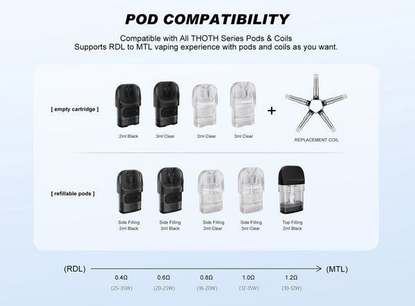 Introducing the latest addition to the THOTH series - THOTH G. Featuring a robust 900mAh battery and adjustable wattage ranging from 5 to 35W, this device offers both power and flexibility. The THOTH G is designed to be versatile, with pod cartridges and coils from the entire THOTH series being compatible. Combined with its precise adjustable airflow system, you can seamlessly transition from RDL to MTL vaping, ensuring a full and satisfying experience. Whether you prefer freebase or nicotine salt e-liquids, the THOTH G is ready to deliver.