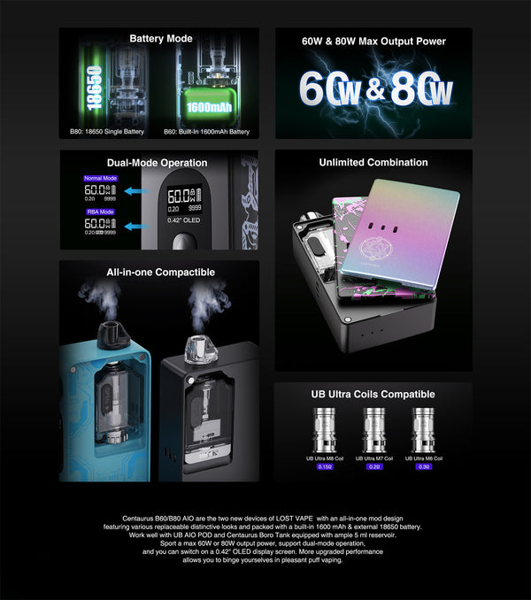 The Lost Vape Centaurus B60 AIO Kit, offering a 5-60W range, Quest 2.0 Chipset, and the UB Ultra Coil compatible UB AIO Pod for vapor output. Constructed from durable stainless...