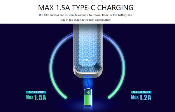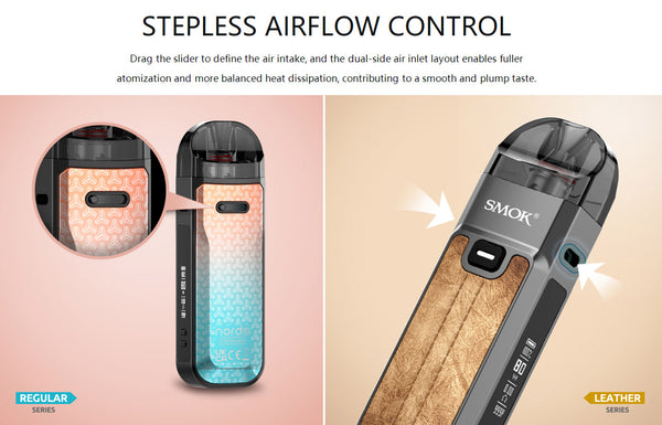 Smok Nord 5 Kit boasts a DL vaping with a 2000mAh internal battery, 5W-80W output range, and 5ml Smok Nord 5 Pod that has a preinstalled RPM 3 Meshed 0.15ohm coil. Nord 5 has regular series and leather series to choose from, you can navigate up to 80W output from its 0.69inch OLED screen, working hand in hand with the dual-side airflow system for sought-after flavor. You will also obtain the desired cloud due to the adjustable airflow by dragging the slider. Smok Nord 5 Pod highlights a wide-bore mouthpiece, 5ml vape juice capacity, and side filling system. It is compatible with Smok RPM 3 coil series, featuring a meshed structure and a low coil resistance, which is perfect for freebase e-juice and DL vaping.