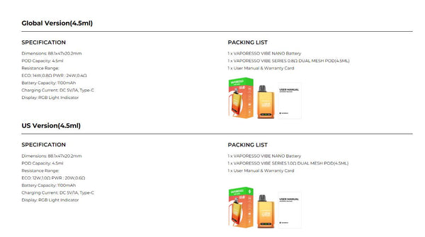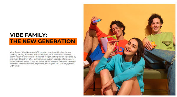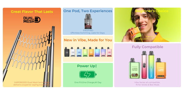 VIBE SE & Vibe Nano Pod Designed for MTL beginners, this duo combines simplicity with advanced performance. Powered by the Axon Chip, both devices feature one-button operation and VAPORESSO's Dual Mesh technology (0.8ohm ECO mode at 14W for flavor exploration; 0.4ohm PWR mode at 24W for instant satisfaction), delivering ultra-smooth, enduring taste even for veteran vapers. The 1100mAh battery supports all-day use, recharged swiftly via Type-C (5V/1A). A 4.5ml leak-resistant pod minimizes refills, while the RGB light indicator simplifies power monitoring.it's your pocket-sized gateway to hassle-free vaping.