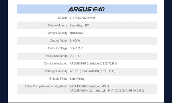 Cartridge Included: Argus E40 Cartridge 0.3ohm (Pre-installed), Argus E40 Cartridge 0.6ohm