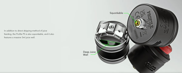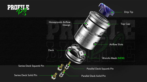 Wotofo Profile PS RDA, the collaboration of Wotofo and Mrjustright1, is a dual mesh RDA with 810 Resin Drip Tip. Wotofo Profile PS Dual Mesh RDA features adjustable side airflow with flexible honeycomb. Wotofo Profile PS supports direct dripping method & squonkable way to fill e-juice.